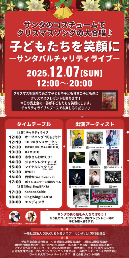 サンタバルの初日を飾るチャリティステージをなんば広場で行います。